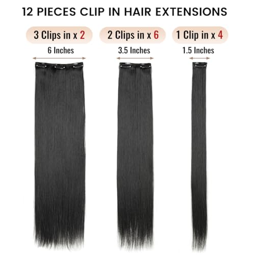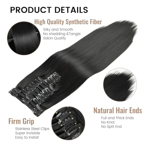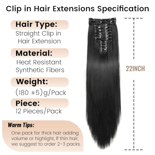 22 Inch Long Straight Clip in Hair Extensions 180 Grams 12PCS Clip in Synthetic Fiber Hair Extensions Natural Black Full Head Double Weft Hairpieces for Women